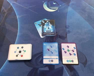Grâce aux éléments indiqués sur les cartes TERRAIN, on collecte les ressources nécessaires. La face TERRAIN compte un seul élément (C, H, N, O, P ou S) alors que la face explorée, peut en compter plusieurs.