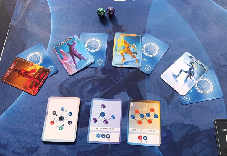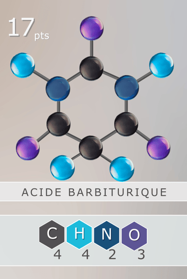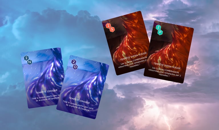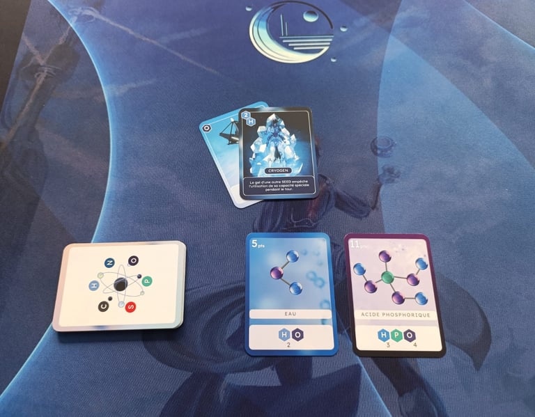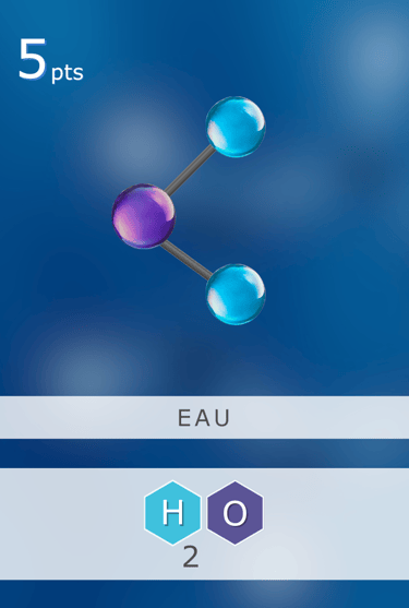 Exemple : si la carte EAU est retournée, on peut l’acquérir avec au minimum 2 Hydrogène (H) et 1 Oxygène (O).