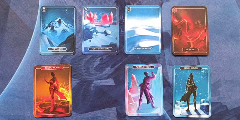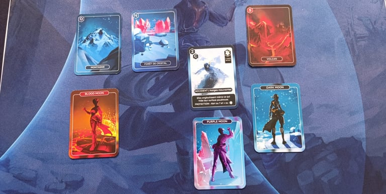 Celle ou celui qui démarre pose les cartes TERRAIN au milieu de la table. Le nombre de cartes à distribuer correspond au nombre de joueurs·ses + 1 carte. Elles sont placées face terrain visible.